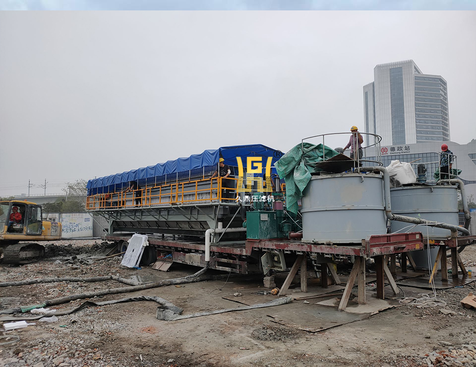 打桩建筑、隧道、盾构、环境污染污水应急处理等工程施工中所产生的废弃泥浆或污水现场脱水;对施工产生的废弃泥浆进行现场脱水处理,形成泥饼与清水,使原来的废弃泥浆外运排放改变为渣土外运处置,分离出的清水能全部回收用;压滤机放置于17.5的平板车上,便于工地转场施工。