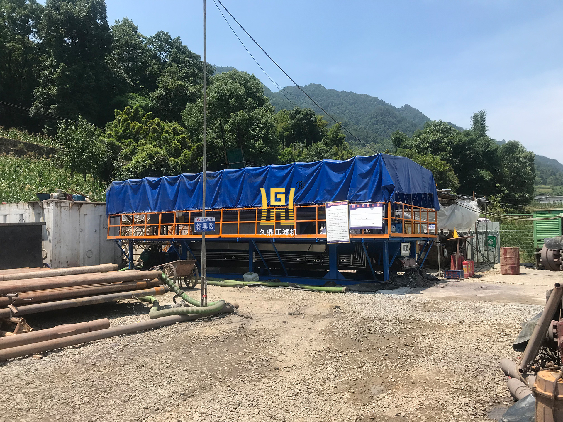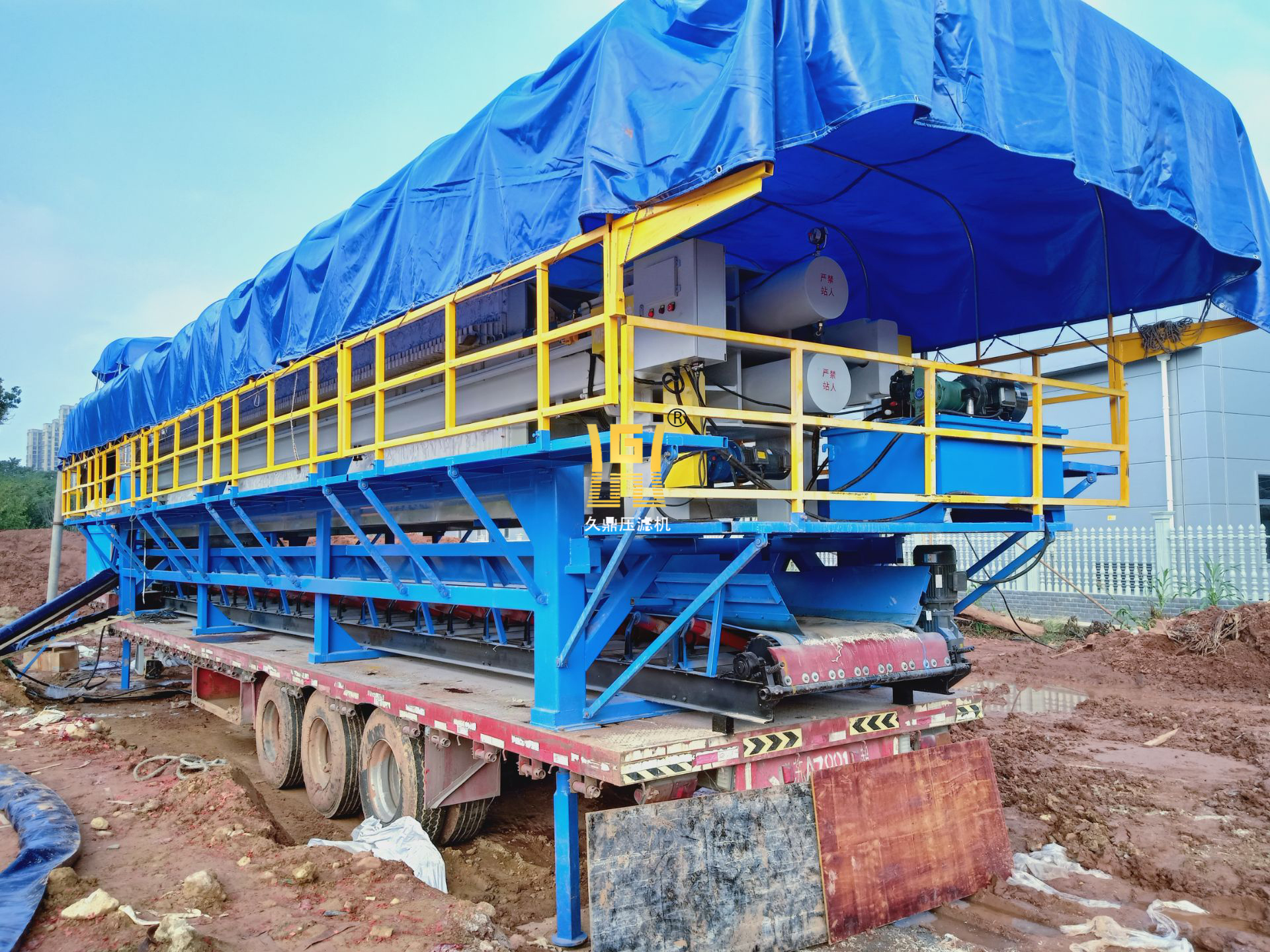 打桩建筑、隧道、盾构、环境污染污水应急处理等工程施工中所产生的废弃泥浆或污水现场脱水;对施工产生的废弃泥浆进行现场脱水处理,形成泥饼与清水,使原来的废弃泥浆外运排放改变为渣土外运处置,分离出的清水能全部回收用;压滤机放置于17.5的平板车上,便于工地转场施工。