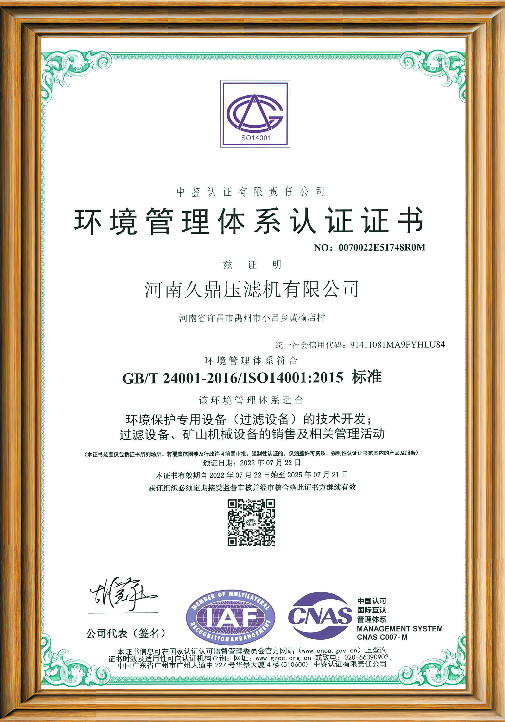 环境管理体系认证证书