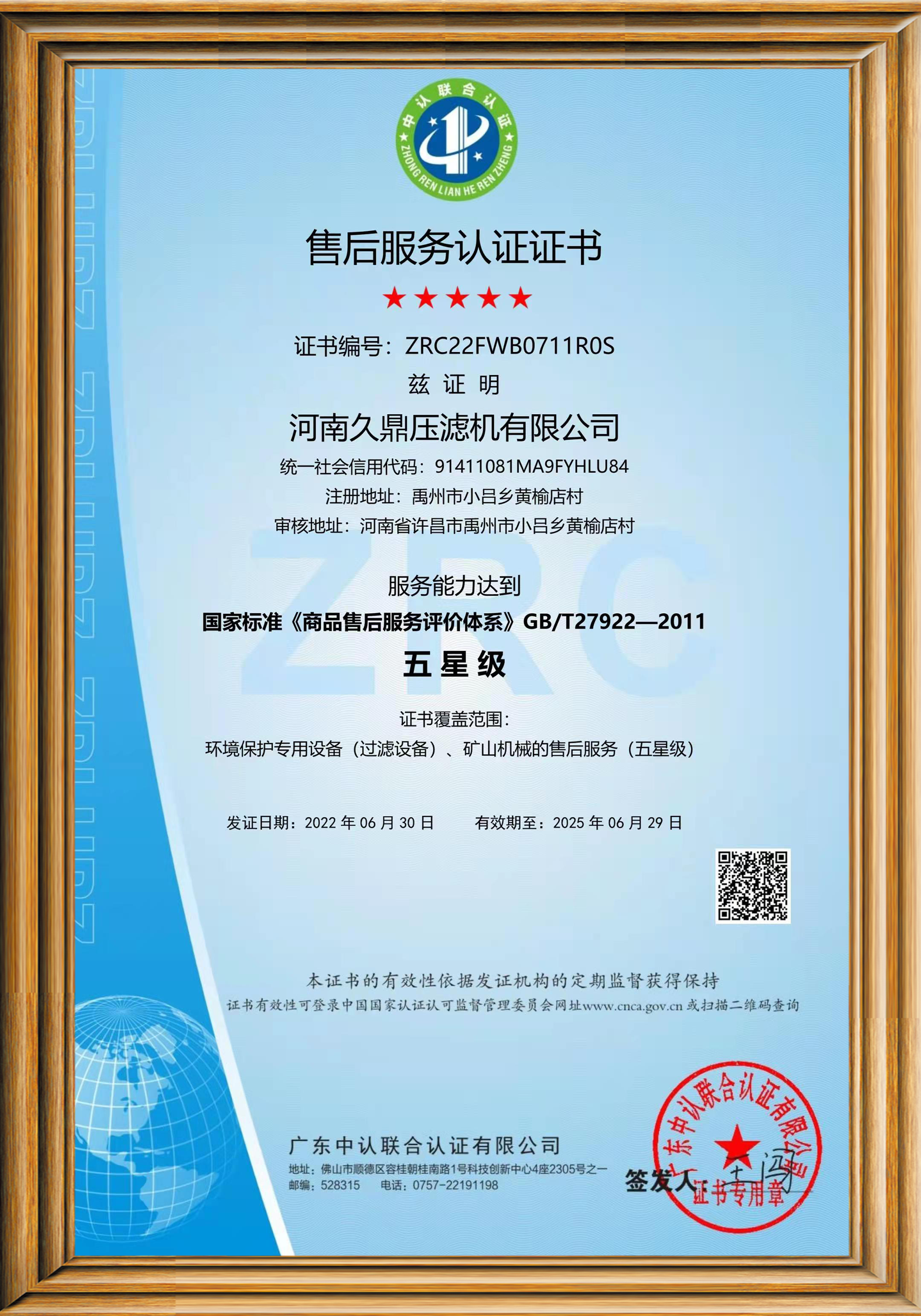 售后服务认证证书