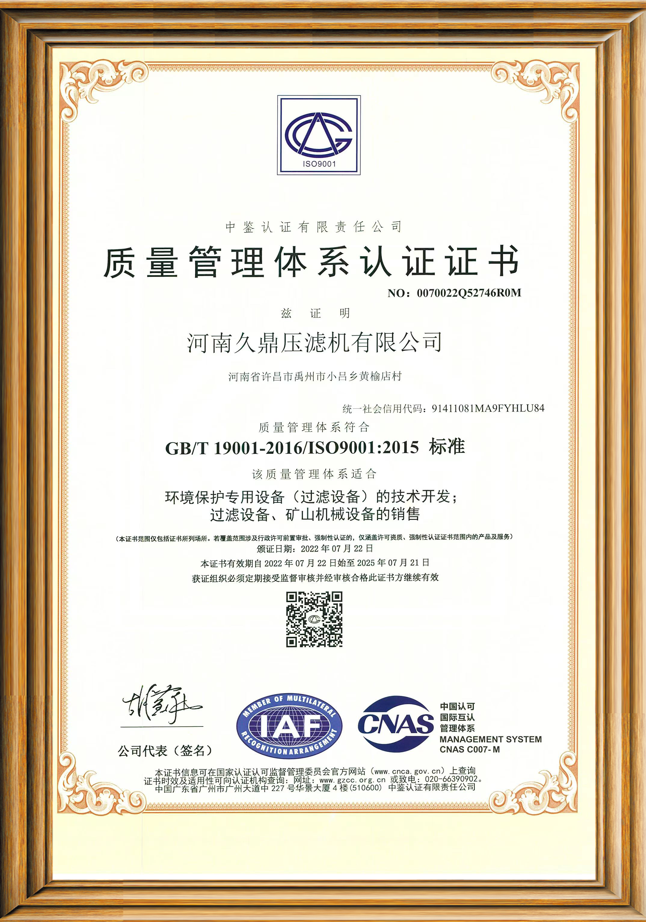 质量管理体系认证证书