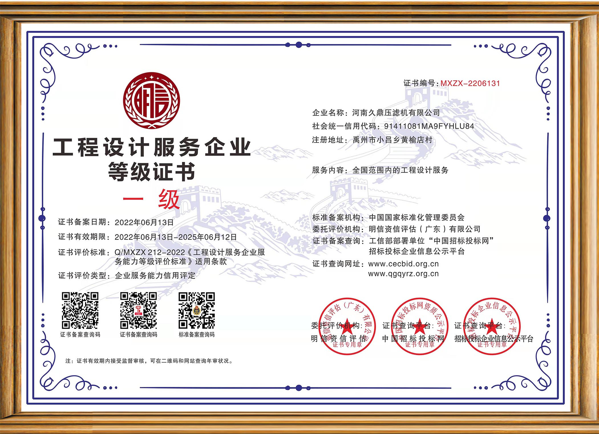 工程设计服务企业等级证书